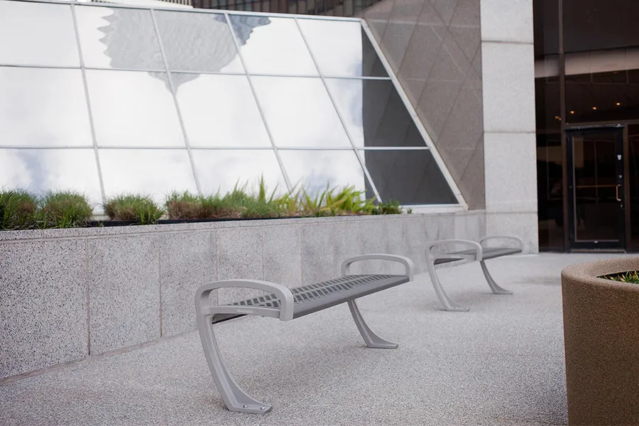 座椅腿铸铝材质,表面户外抗U高耐候氟碳漆喷涂,椅面部分不锈钢激光切割焊接成型,表面抗U高耐候氟碳漆喷涂。不锈钢坐凳不仅为城市空间增添了现代感,还为市民提供了舒适的休憩场所,展现了美学与实用的完美结合。