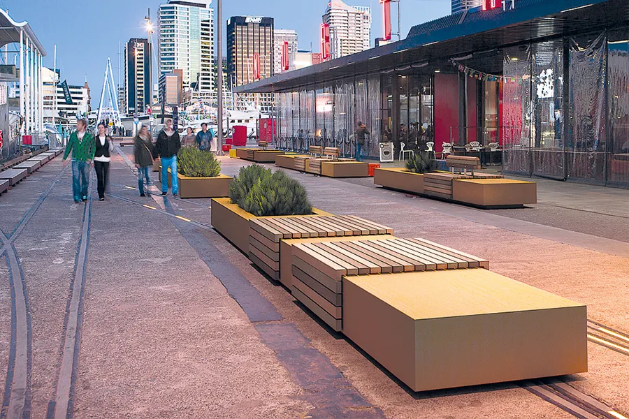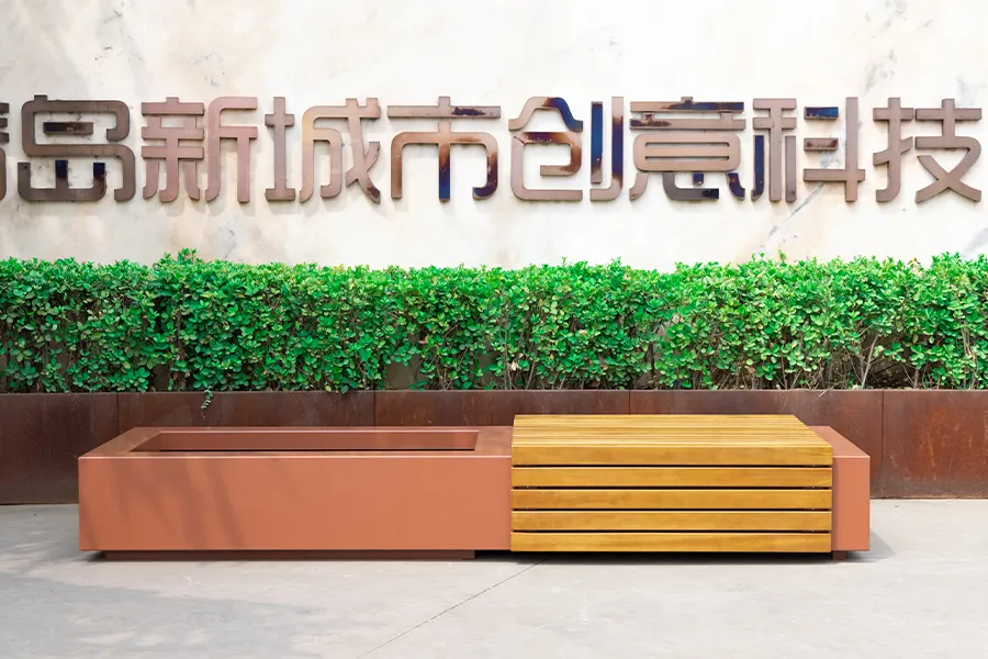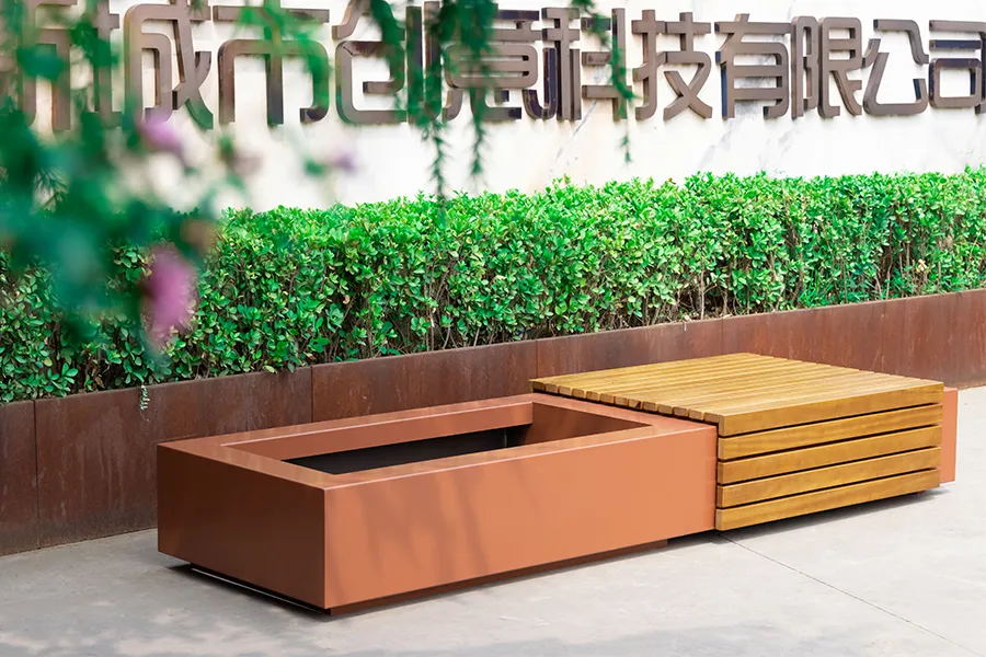 天路花箱式座椅集合了常规户外座椅和花箱功能的基础上,根据实际需求定制化的一种组合座椅,金属部分是碳钢板/耐候钢板激光切割焊接成型,表面喷塑,木材部分进口柳桉木,表面户外水性木器漆喷涂。