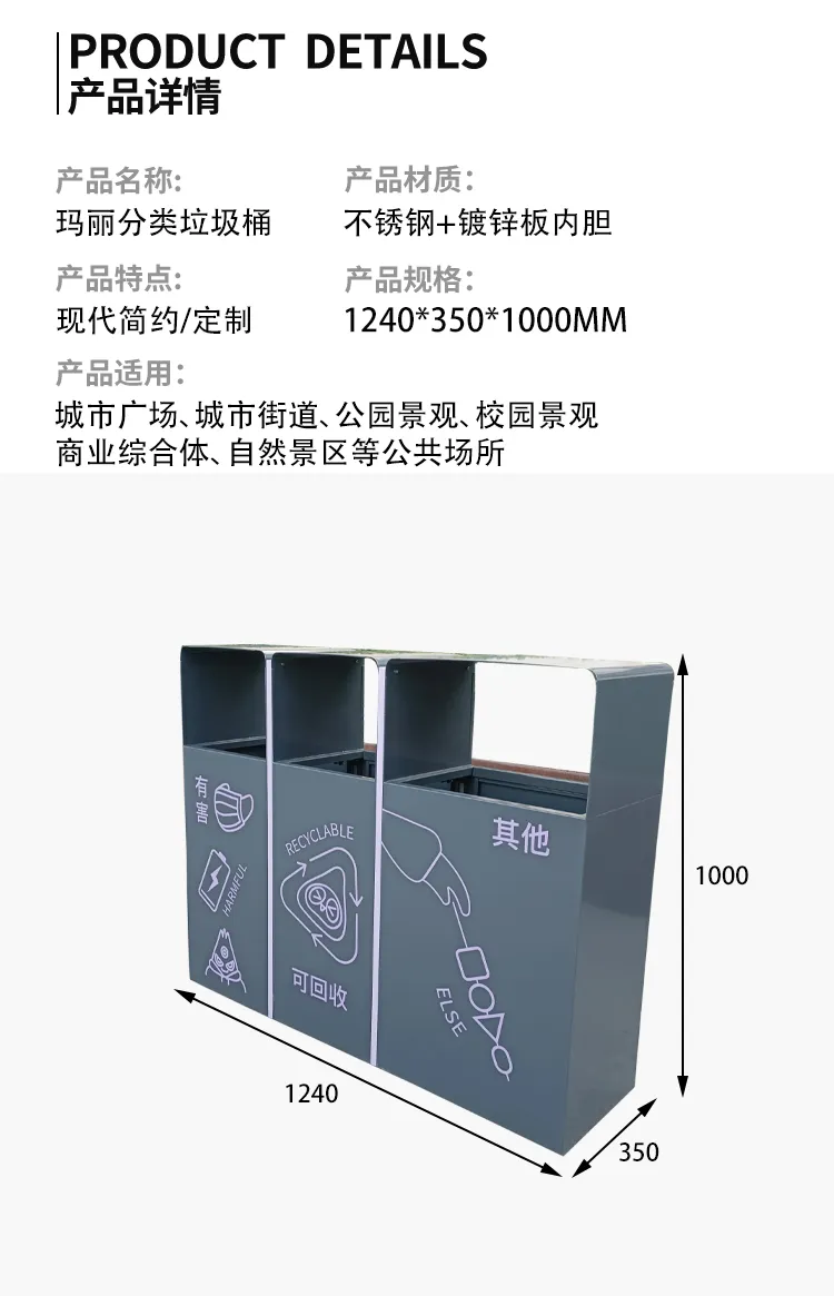 玛丽分类垃圾桶桶身304不锈钢数控激光下料折弯焊接成型,表面静电喷塑,图案可丝印,喷绘。分类垃圾桶在实现可持续发展和环境保护方面起着至关重要的作用。我们每个人都应该积极参与垃圾分类行动,正确使用分类垃圾桶,为创造一个更清洁和可持续的环境贡献自己的力量。