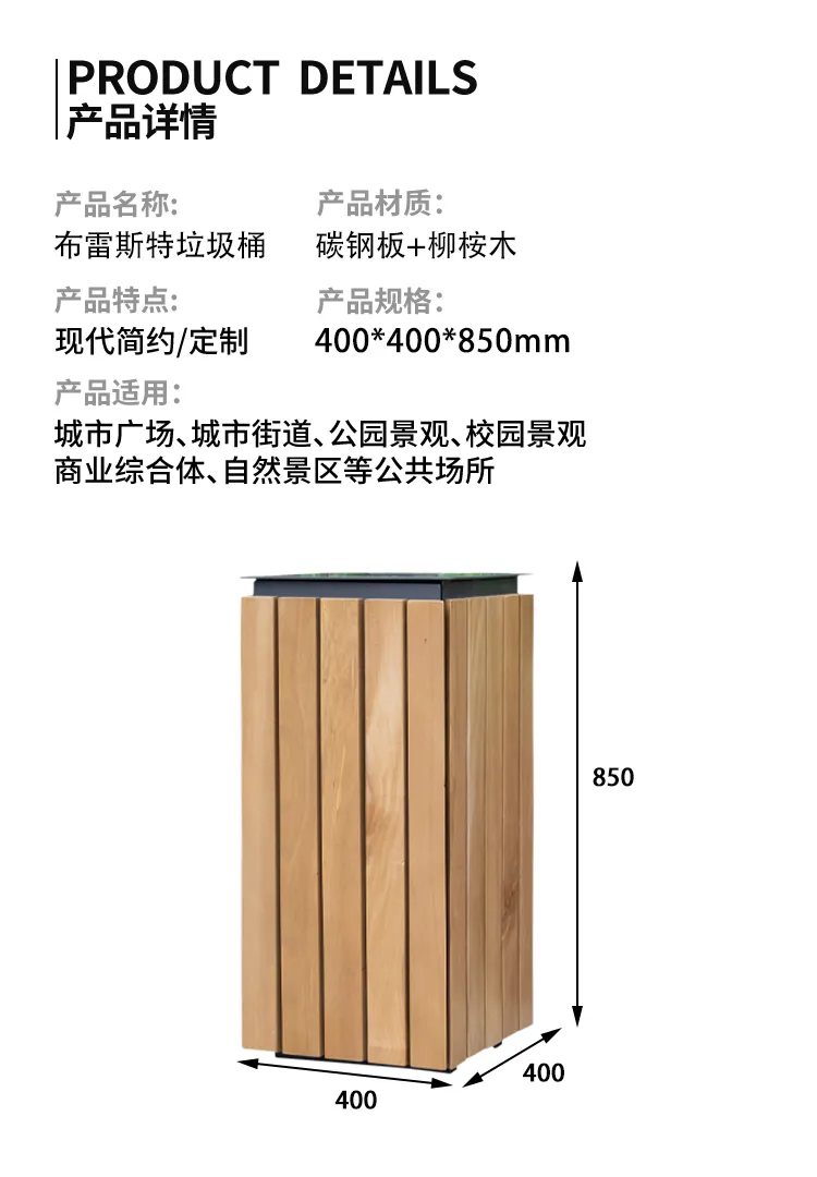 金属部分碳钢板,表面喷塑,木材柳桉木,表面户外水性木器漆。户外垃圾桶在城市环境中扮演着重要的角色,其耐腐蚀、易清洁和长寿命的特点使其成为公共场所的理想选择,布雷斯特垃圾桶适用于公园,景区,售楼部,电梯旁等公共场所。